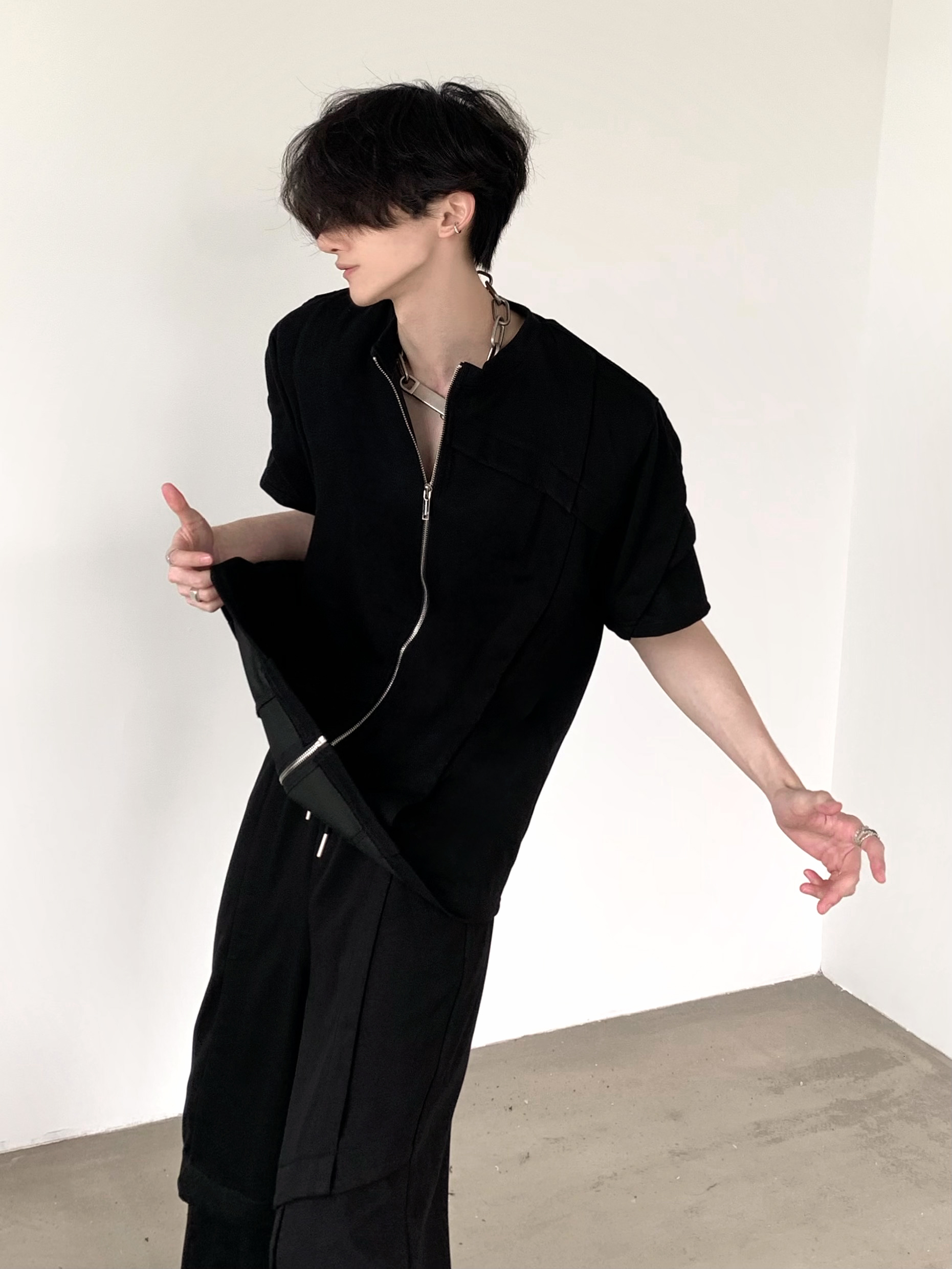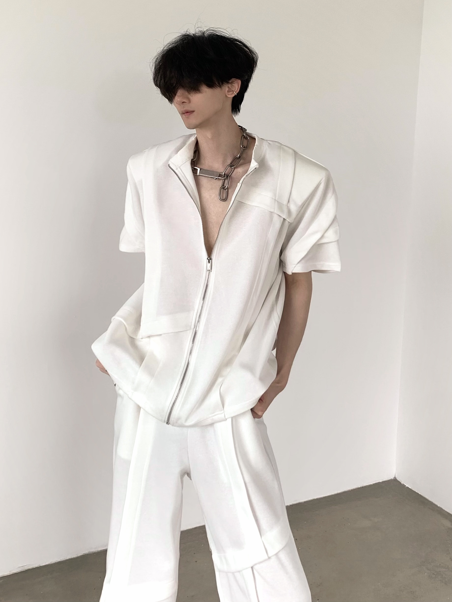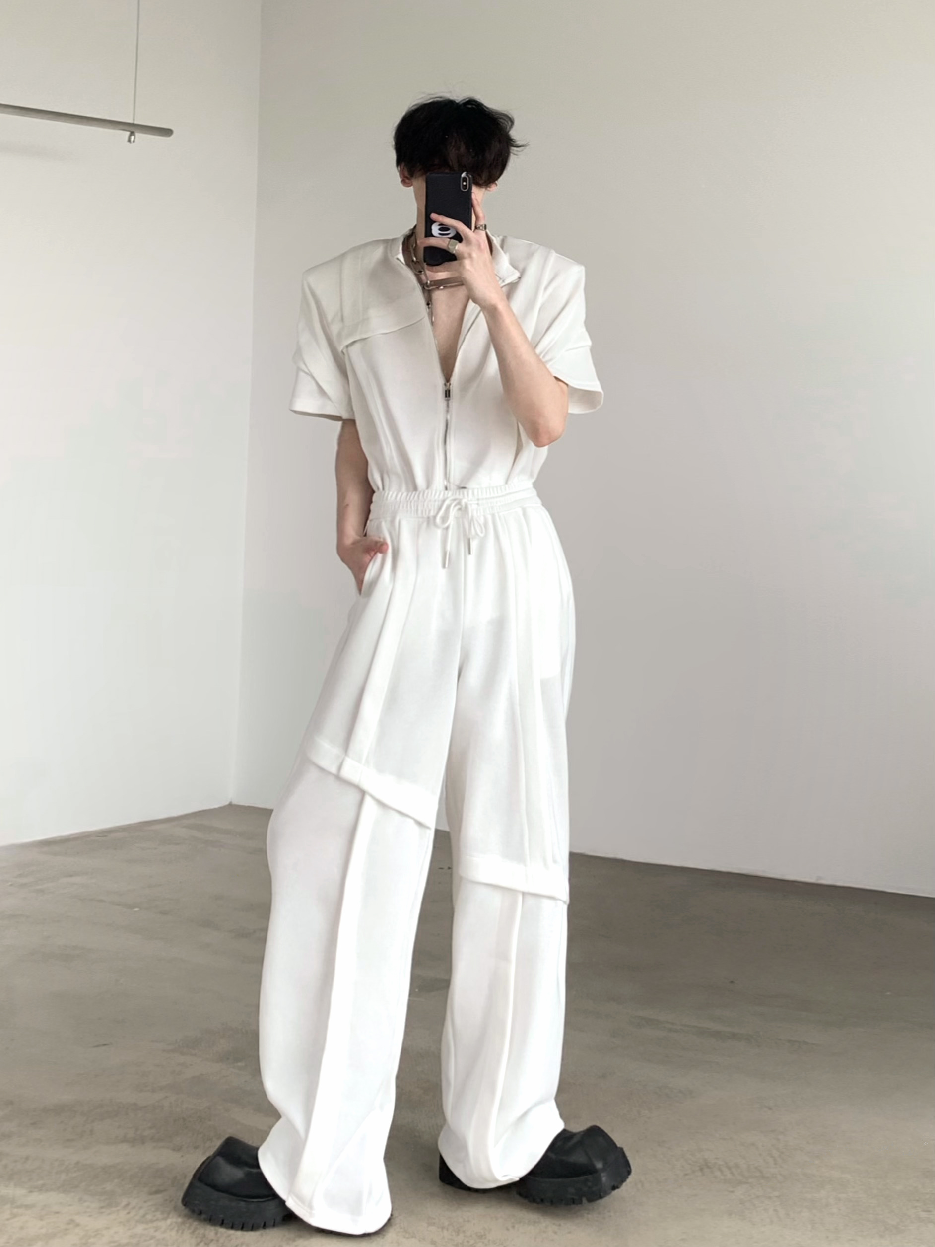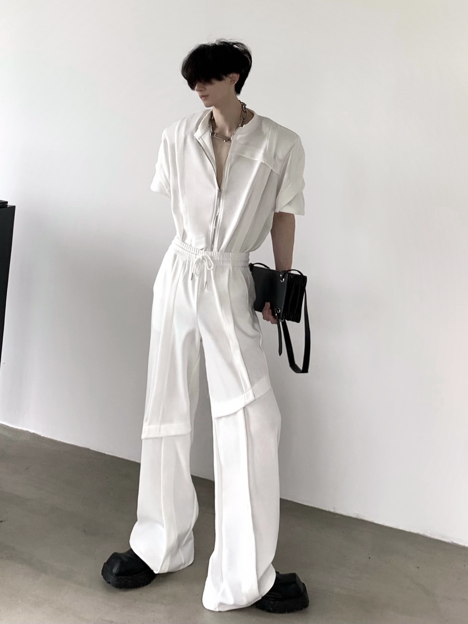 Patchwork Zipper Short Sleeve Shirt & Wide-Leg Straight Sweatpants Setup WN7067