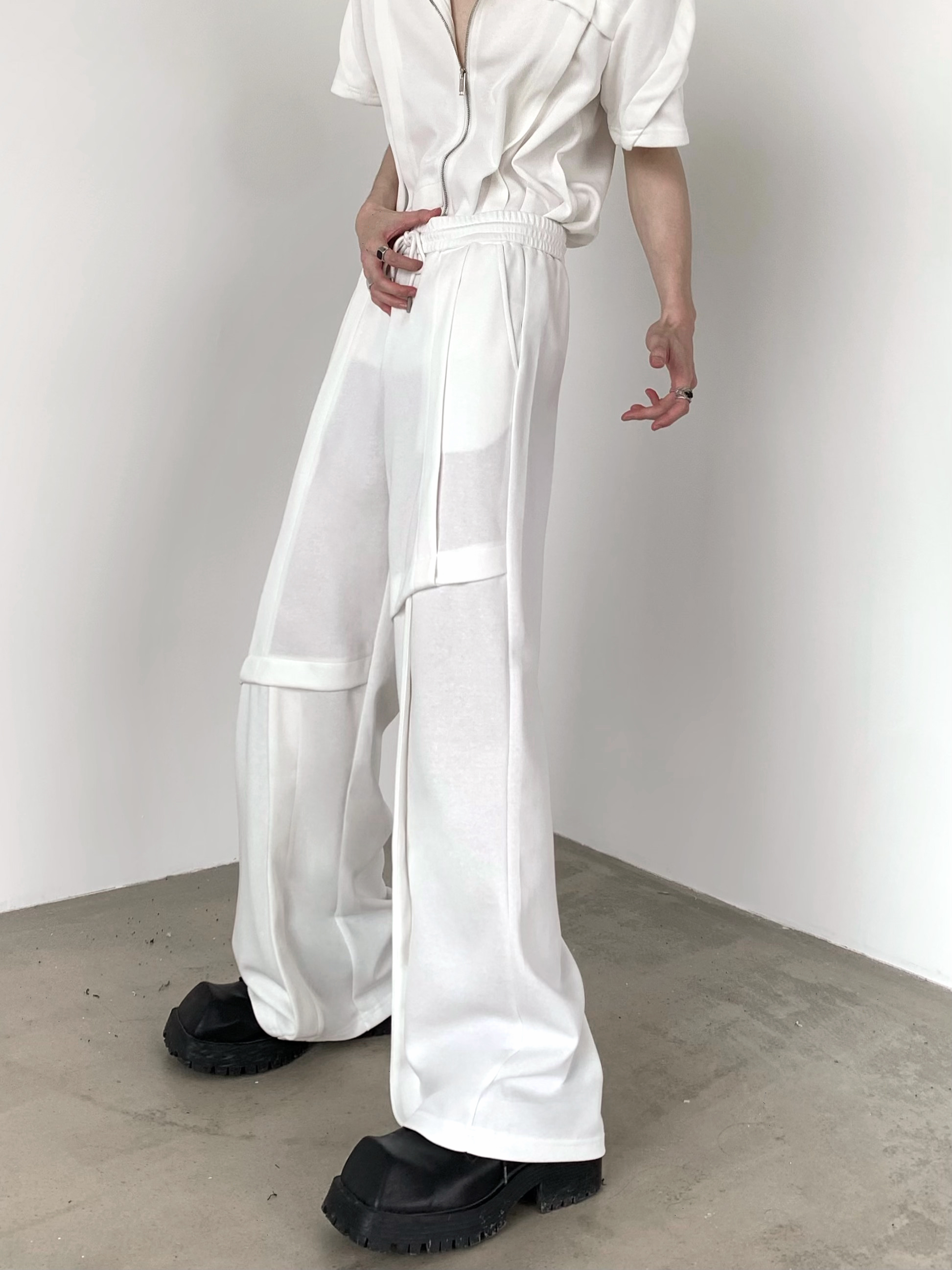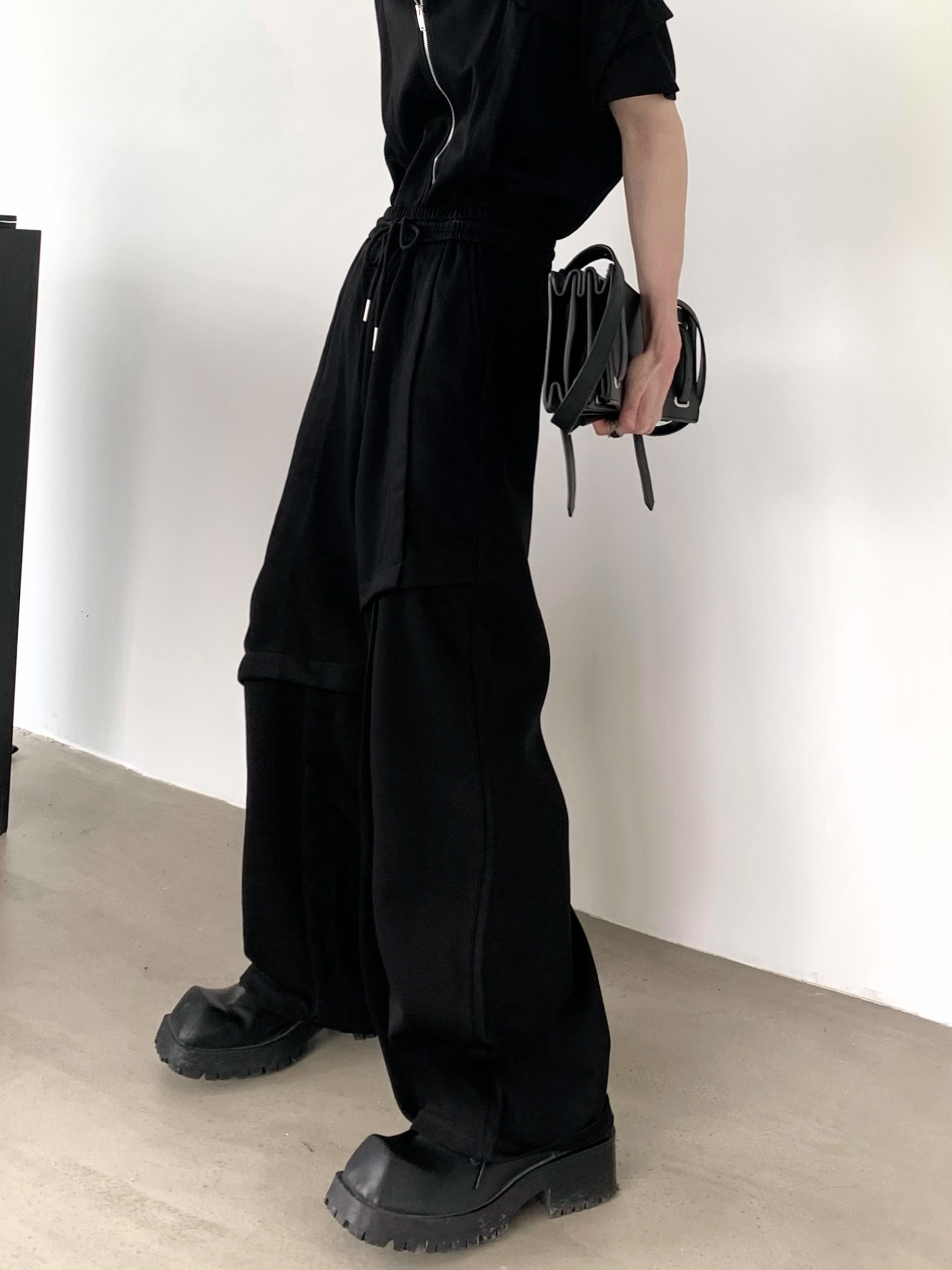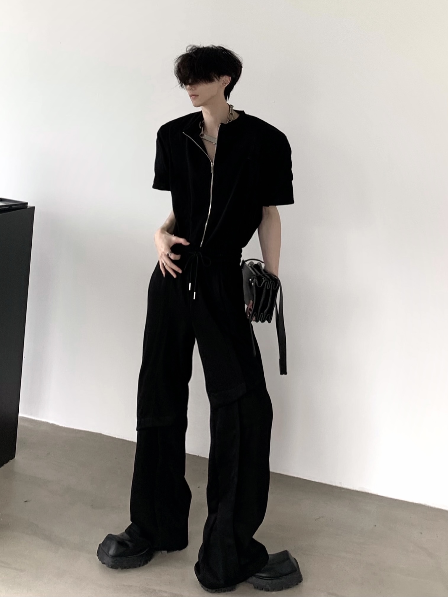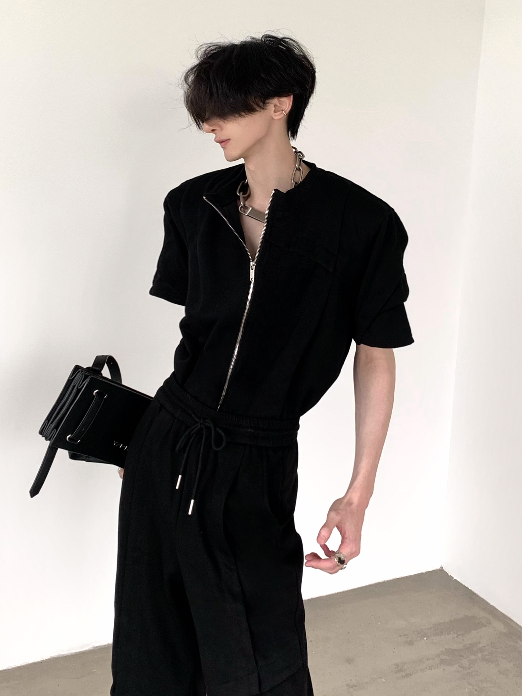 Patchwork Zipper Short Sleeve Shirt & Wide-Leg Straight Sweatpants Setup WN7067