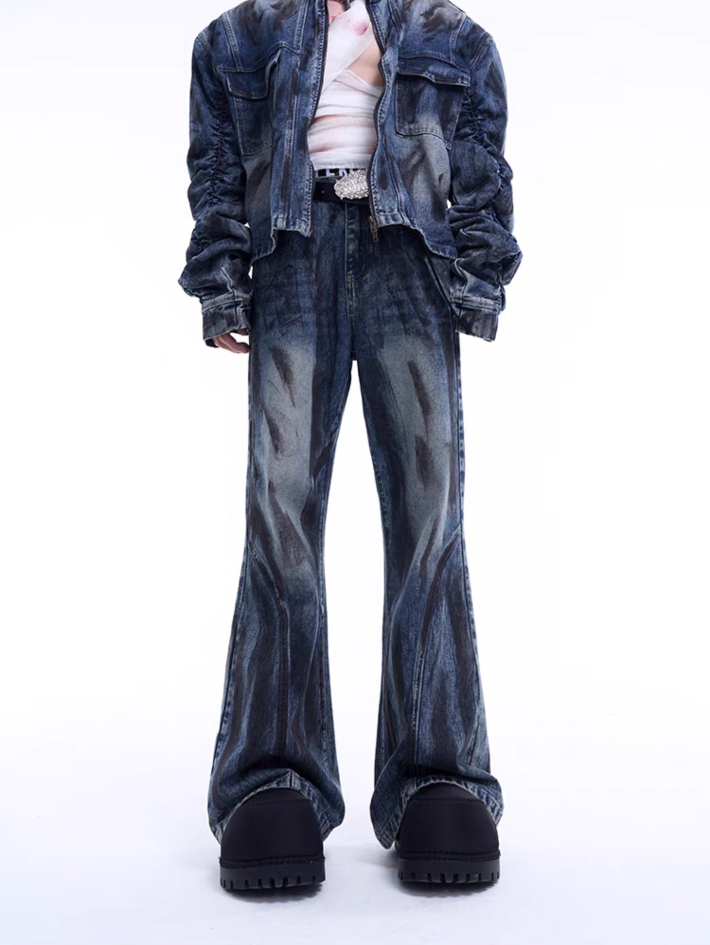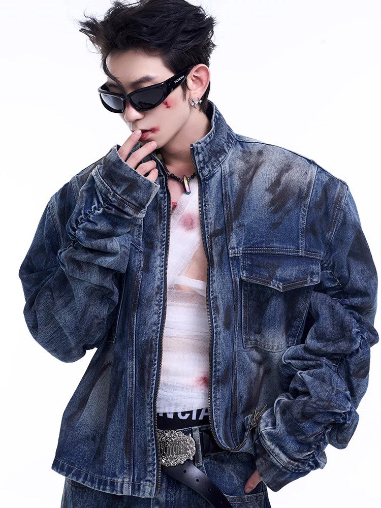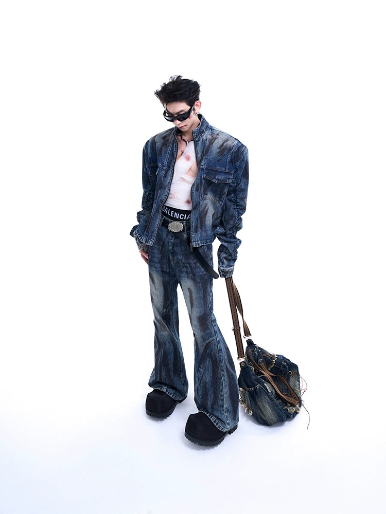 Wrinkles Sleeve Stand Neck Denim Jacket & Micro Flare Denim Jeans Setup WN8069
