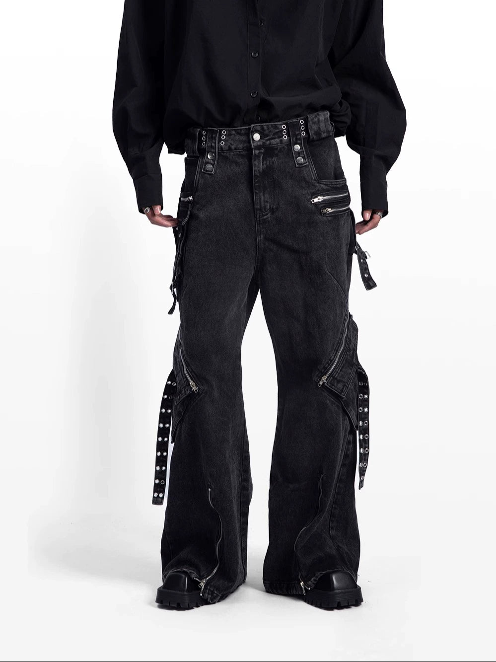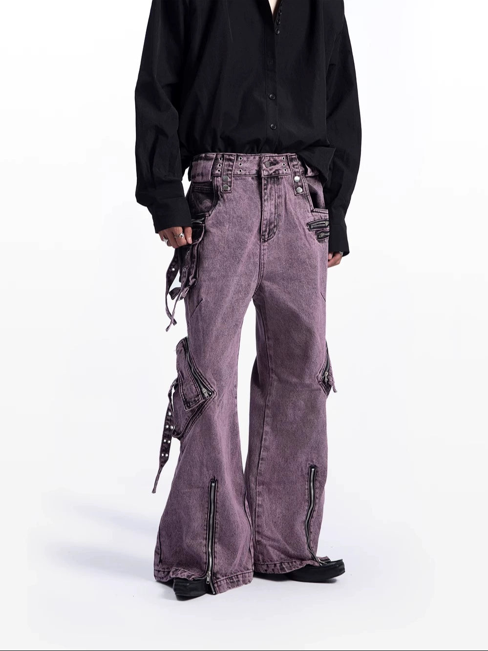 Washed Multi-Pocket Flare Cargo Denim Jeans WN9222