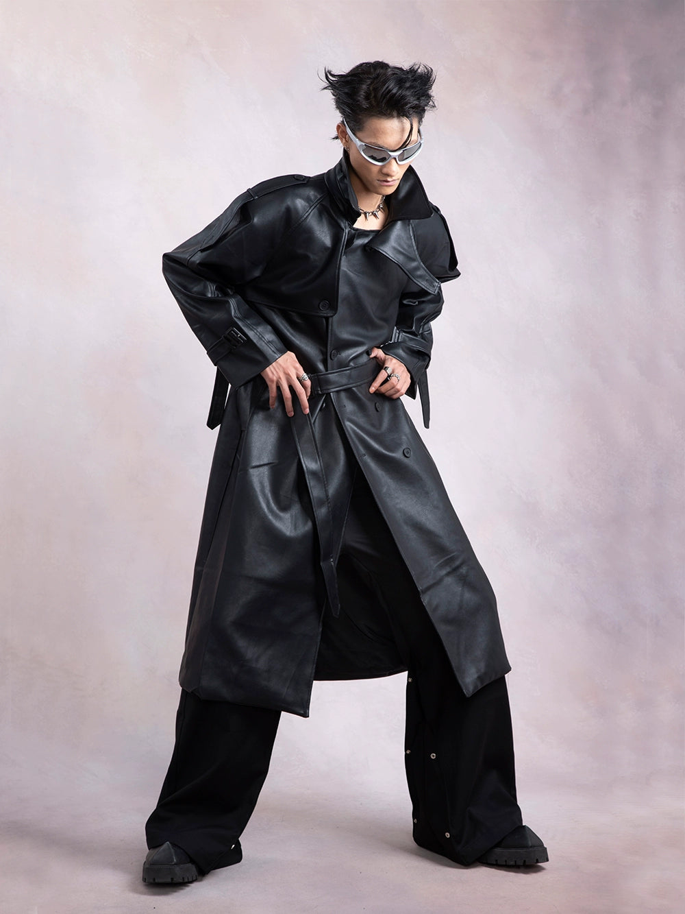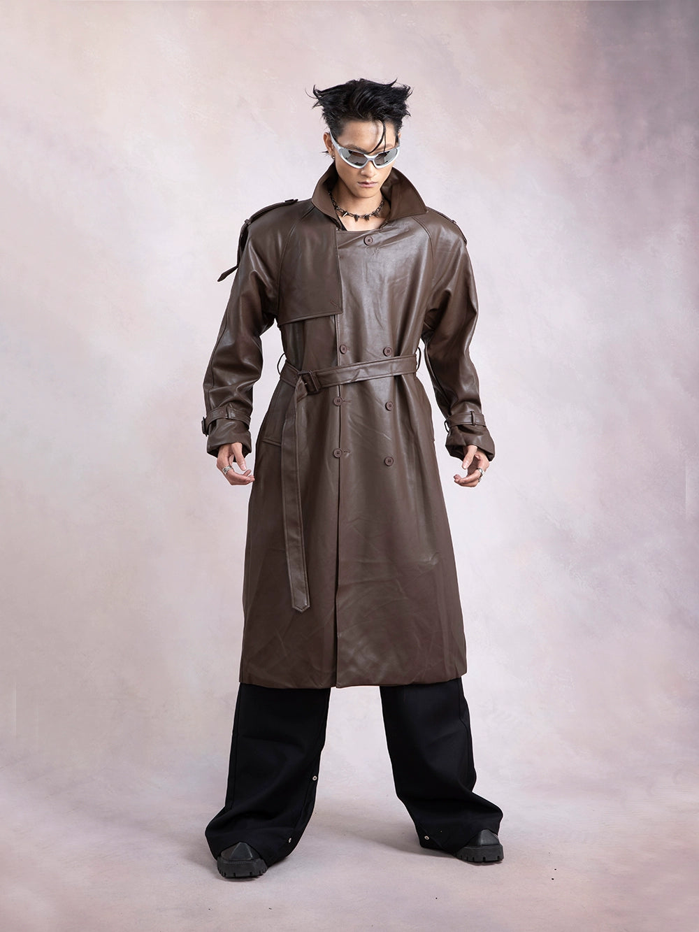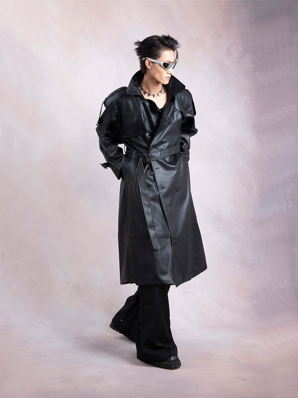 Shoulder Pad Over-Knee PU Leather Coat WN9324